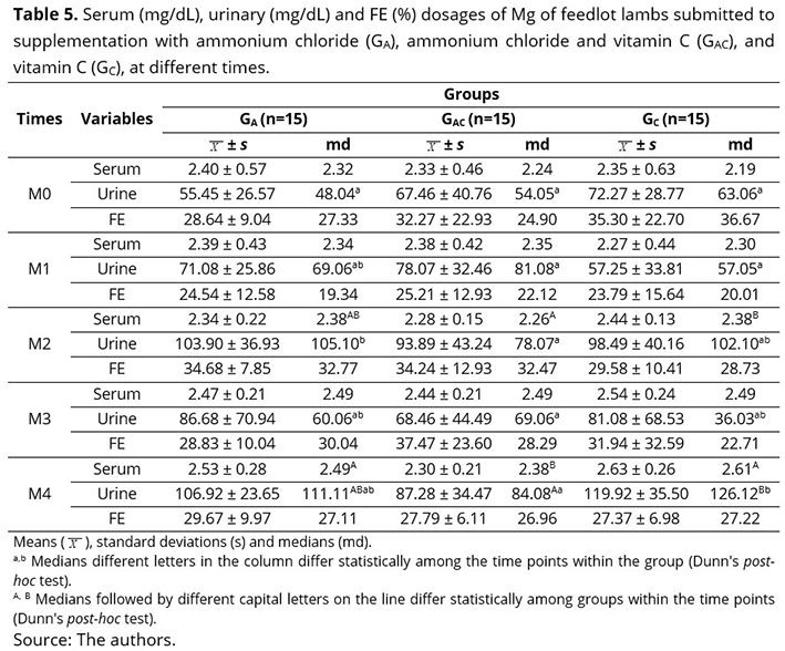 The concentrations of urinary Mg (Table 5) exhibited a statistical difference across the time points in the three groups and exhibited wide variation; however, the highest median values were observed at M4 in all groups, with the highest value in GAC. Similarly, Maciel et al.(29) reported a progressive increase in urinary Mg excretion in sheep fed an unbalanced diet.