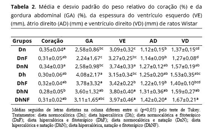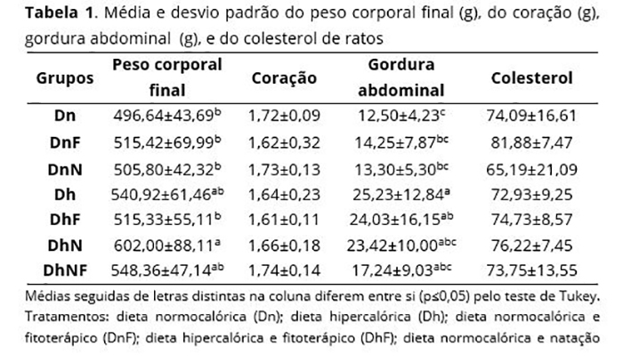 Os tratamentos consistiram em: grupo com dieta normocalórica (Dn); dieta hipercalórica (Dh); dieta normocalórica e fitoterápico (DnF); dieta hipercalórica e fitoterápico (DhF); dieta normocalórica e natação (DnN); dieta hipercalórica e natação (DhN), e grupo submetido à dieta hipercalórica, natação e fitoterápico (DhNF).