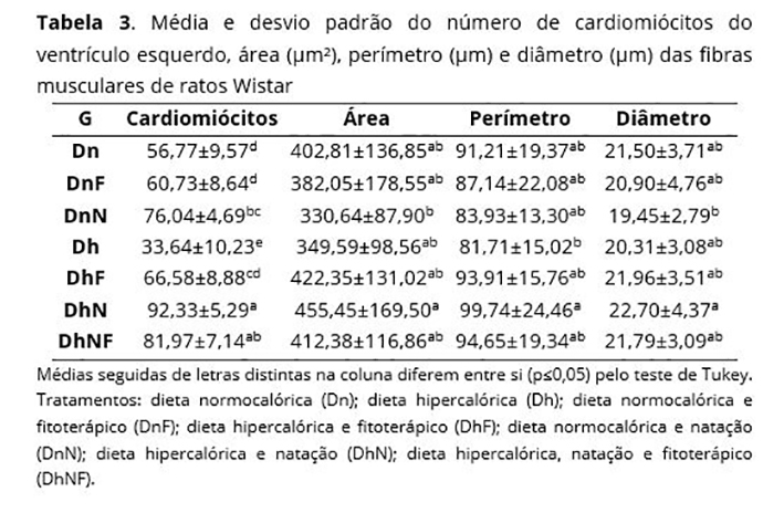 O grupo tratado com dieta hipercalórica (Dh) apresentou menor quantidade de cardiomiócitos (Tabela 3), assim como descrito por Okere et al.(42) que relataram que os ácidos graxos presentes em dietas ricas em gordura ocasionam a perda dos cardiomiócitos. Schipke et al.(43) observaram um menor número de cardiomiócitos em camundongos obesos.