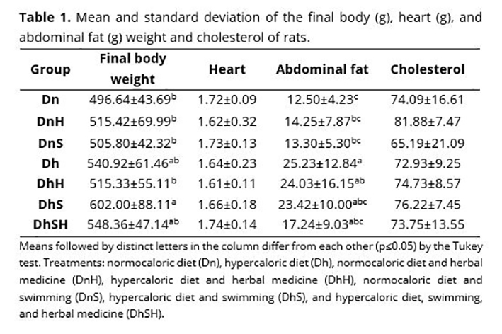 The treatments consisted of groups with a normocaloric diet (Dn), hypercaloric diet (Dh), normocaloric diet and herbal medicine (DnH), hypercaloric diet and herbal medicine (DhH), normocaloric diet and swimming (DnS), hypercaloric diet and swimming (DhS), and hypercaloric diet, swimming, and herbal medicine (DhSH).
