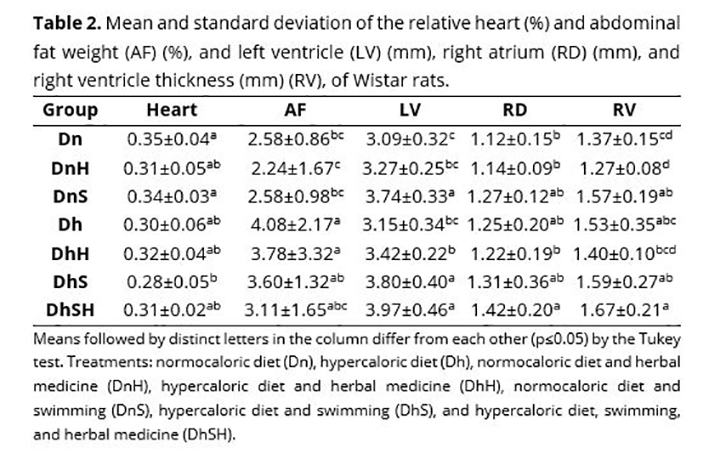 After certification of anesthesia, the hearts were removed and weighed for macroscopic evaluation as to color, contour, consistency, and wall thickness in the middle region of the right and left ventricles and right atrium, obtained using a Digimess® digital caliper. Abdominal fat from the viscera was removed and weighed to calculate the relative weight, according to the following formula: relative organ weight = (organ weight/live weight) × 100.