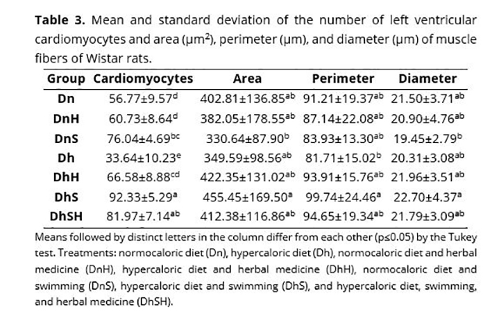 The group treated with a hypercaloric diet (Dh) had a lower amount of cardiomyocytes (Table 3), as described by Okere et al.,(42) who reported that the fatty acids in the high-fat diets caused the loss of cardiomyocytes. Schipke et al.(43) observed a lower number of cardiomyocytes in obese mice.