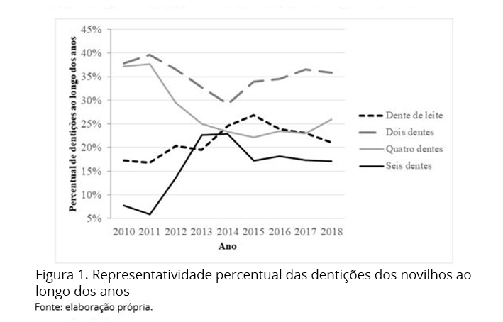 Observa-se na Figura 1 variação na representatividade percentual das dentições dos novilhos ao longo dos anos. O percentual de animais abatidos com quatro dentes diminuiu gradativamente de 2011 a 2016 e aumentou de 2017 a 2018.