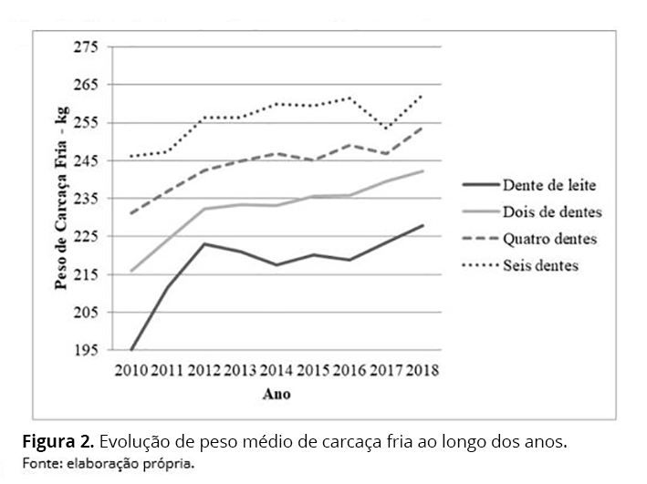 Na Figura 2, embora seja possível observar algumas oscilações durante o período analisado, fica evidente o aumento do peso de carcaça fria de 2010 a 2018 em todas as categorias.