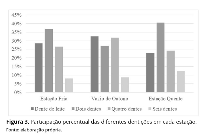 A Figura 3 mostra que o maior número de animais dente de leite, foram abatidos na estação vazio de outono e o menor percentual, foi na estação quente, indicando o maior uso dessa categoria em sistemas mais intensivos de alimentação, como os confinamentos utilizados principalmente nas entressafras entre as pastagens de estação quente e de estação fria. A terminação de bovinos na estação quente é resultado de sistemas de terminação a pasto nativo, com ou sem o uso de suplementos.