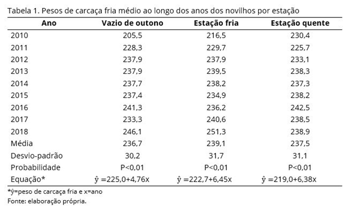 Maior incremento no peso da carcaça fria por ano, encontrado na estação fria, deve-se aos animais oriundos de sistemas de terminação em pastagens cultivadas de inverno. Nesse sentido, Azevedo Junior(15) concluiu que a utilização de pastagens de inverno, juntamente à suplementação é uma alternativa que contribui para aumentar a velocidade de crescimento dos animais e reduzir a idade de abate.