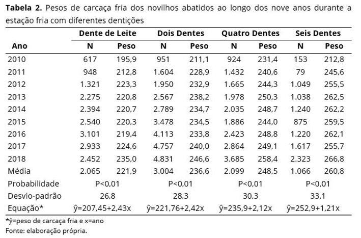 Com base nos dados da Tabela 2, pode-se observar que animais mais jovens abatidos na estação fria apresentaram maior incremento anual de peso, novilhos abatidos com dentição de leite, dois e quatro dentes, apresentaram incremento acima de 2,0kg no peso de carcaça fria por ano, enquanto os novilhos abatidos com seis dentes apresentaram menor incremento de peso na estação fria, com apenas 1,2 kg/ano.