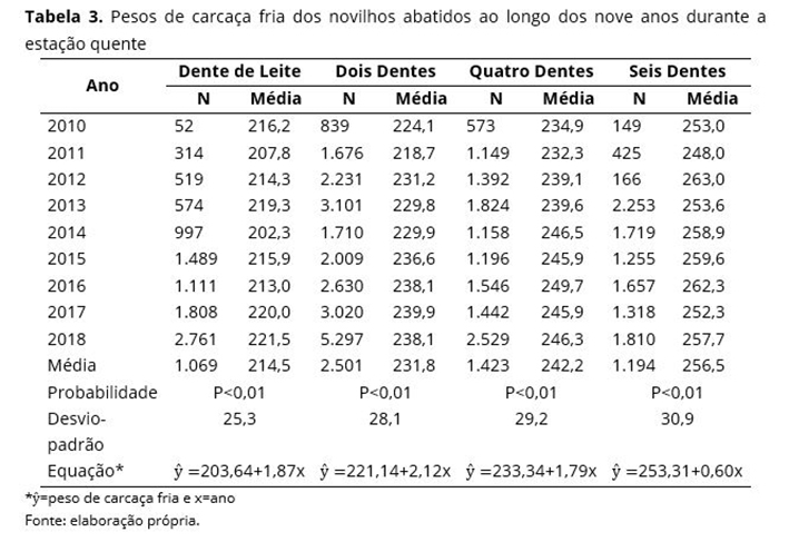 A Tabela 3 mostra que os novilhos terminados com dentição de leite, na estação quente, apresentaram incremento anual de 1,87 kg de carcaça fria (P<0,01), e os animais abatidos com dois dentes incremento de 2,12 kg (P<0,01). O aumento anual no peso de carcaça fria dos animais abatidos com quatro e seis dentes foi menor, 1,79 kg e 0,60 kg, respectivamente. Observa-se elevação na precocidade de abate, em razão dos maiores incrementos no peso de carcaça fria encontrados foram nas categorias de animais abatidos com dentição de leite e dois dentes.