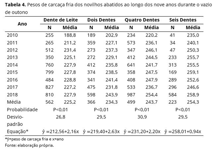 A Tabela 4 mostra que ao longo dos anos na época do vazio de outono existe maior participação de novilhos abatidos com dentição de leite e o menor número de animais seis dentes, com média de 223 cabeças por ano. Já a classificação dente de leite atingiu média de 562 animais por ano.
