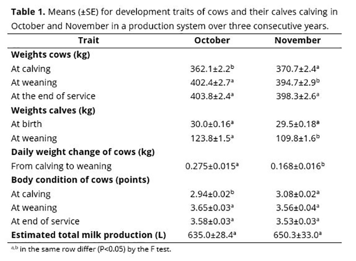 The weights of the cow-calf pair differed at calving and at weaning (P<0.05). Higher values at calving were obtained for dams calving in November, and at weaning for those calving in October.