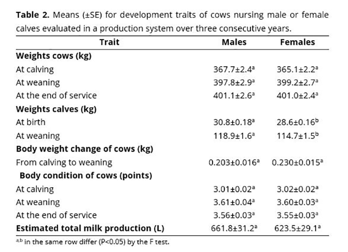 Despite the additional 38 kg of milk produced by cows nursing male calves, the milk yield of cows nursing male and female calves was similar (P>0.05). The literature is contradictory with respect to milk yield and calf sex, with cases of cows nursing male calves producing more milk than those nursing female calves(18), or even a lack of effect on milk production, which was related to other factors(19).