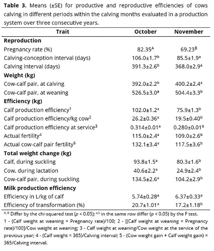 Higher efficiency rates were observed in cows calving in October, irrespective of the evaluation method, considering calf weight at weaning, pregnancy rate, and calving interval. On average, considering the different evaluation parameters, cows calving in October were superior by 19.76% for this variable in relation to those calving in November.