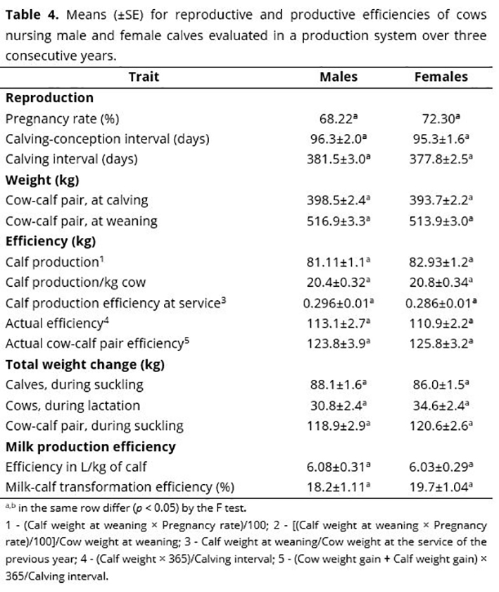 Calf sex did not influence the reproduction-related traits or the production efficiency of the herds (P>0.05); similar values were obtained for the efficiency of conversion of milk into calf body weight gain (Table 4). The higher weights of male calves (Table 2) were not sufficient to suggest higher efficiency, because when these weights were associated with the pregnancy weight of the cows, those nursing heifers had similar performance (P>0.05).