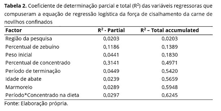 A região do Brasil em que a pesquisa foi realizada contribuiu com 2% na variação da força de cisalhamento (Tabela 2). A participação do genótipo zebuíno contribuiu com 11,8% da variação da maciez, enquanto 31,4% da variação estiveram relacionados ao percentual de concentrado utilizado nas dietas. O peso ao início da terminação (4,44%), período de terminação (4,49%), idade de abate (2,39%) e grau de marmoreio da carne (2,89%) explicam 14,21% da variação da força de cisalhamento. Ainda houve interação entre o período de terminação e percentual de concentrado na dieta (2,97%). Somados, esses fatores explicam 62,45% da força de cisalhamento das carnes dos novilhos confinados utilizados nas pesquisas brasileiras nos últimos 20 anos.