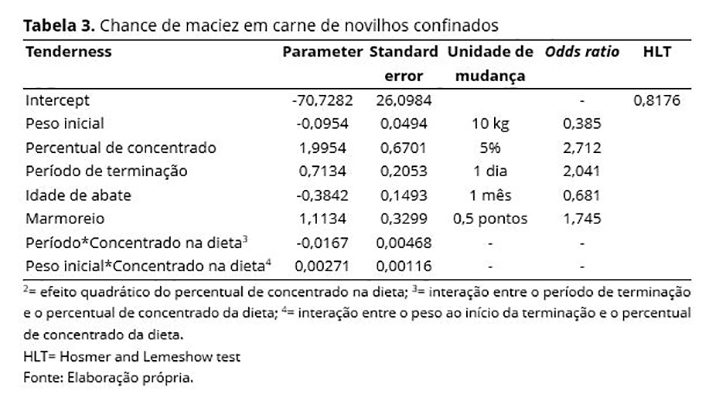 Para a interpretação dos coeficientes, utilizou-se a razão de chances (odds ratio) estimada por OR=exp (bk), que é a razão das proporções para dois resultados possíveis, ou seja, a razão entre sucesso (πj) e fracasso (1 - πj) para obtenção ou não de carne macia. As razões entre chances foram baseadas no denominador médio do conjunto de dados para cada modelo. As unidades de mudança das variáveis regressoras foram determinadas de acordo com a experiência dos pesquisadores para a melhor interpretação dos resultados, sendo elas: um mês para a idade de abate; 10 kg para o peso inicial; 5% para o percentual de concentrado na dieta; um dia para o período de terminação; e 0,5 pontos para o grau de marmoreio.