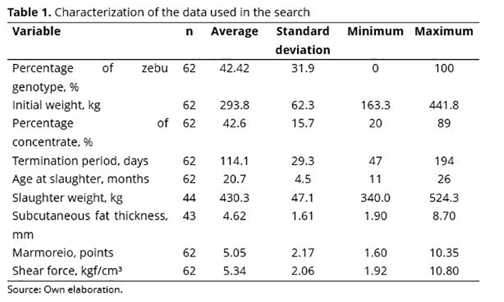 The factors and variables considered for the research were as follows: the region of study (South - 1, Southeast - 2, Midwest - 3, North – 4, and Northeast - 5), genetic predominance (Zebu – 1, Continental Taurine – 2, British Taurine – 3, Synthetic – 4, and Cross - 5), percentage of Zebu background in the genome, body weight at the beginning of termination, percentage of diet concentrate, period of termination, age at slaughter, weight at slaughter, weight of warm carcass, thickness of subcutaneous fat, loin eye area, conformation, shear strength, marbling, juiciness, texture, and coloring of meat.