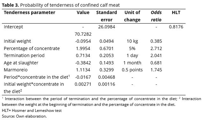 The weight at the beginning of termination, percentage of concentrate in the diet, termination period, age at slaughter, and the degree of marbling of the meat were the factors in the logistic regression equation to explain the chance of tenderness (Table 3). By Hosmer and Lemeshow's test (p = 0.8176), this model predicts satisfactorily the variation in softness. By the odds ratio test, it was possible to identify that for every 10 kg increase in the initial weight of the termination of 430.3 kg of BW, a reduction in the probability of softness of 61.6% is expected. For each 5% increase in the concentrate in diet, on top of besides the 42.6% on average received, there will be a 2.7-fold increase in the probability of obtaining tender meat. The longer the confinement time is, the greater the chance of obtaining tender meat. Every day beyond the 114-day period that the calves remain in confinement, a 2-fold increase in the chance of obtaining tender meat is expected. Age, which shows an inverse effect, reduces the chance of obtaining tender meat; for each month added to the slaughter age of 20.7 months, there was a 31.9% reduction in the chance of obtaining tender meat. Marbling had a positive effect, where an increase of 0.5 points from 5.05 points results in 74.5% increase in the probability of obtaining tender meat.