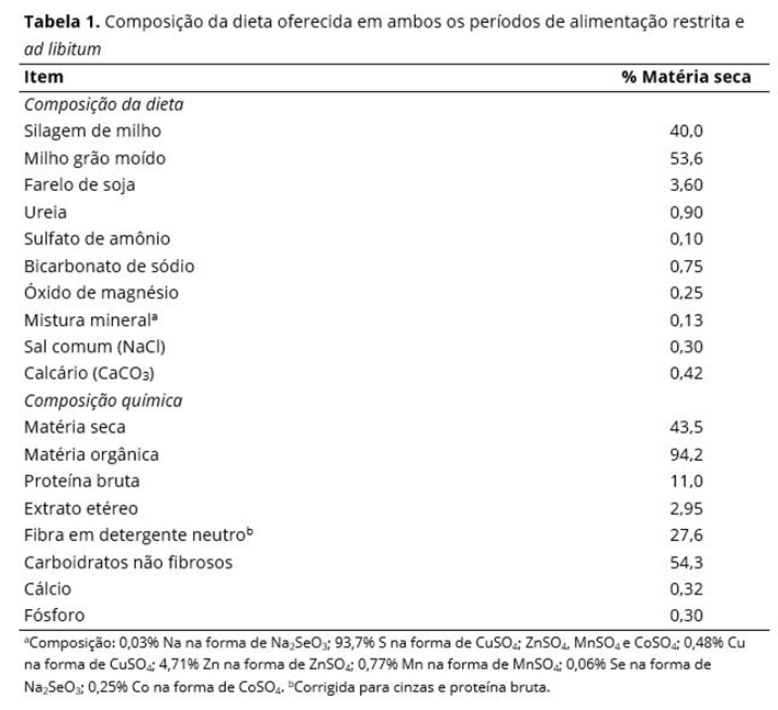 Os mecanismos fisiológicos em bovinos submetidos ao CC foram avaliados(8-10). Contudo, restrições alimentares severas (de 43 a 55 % do consumo ad libitum de MS) e/ou longos períodos (de 95 a 188 d) de restrição alimentar foram utilizados nesses estudos. Na maioria dos estudos, os bovinos que receberam alimentação restrita durante a fase de crescimento apresentaram desempenho produtivo e características de carcaça prejudicados ou necessitaram de tempo adicional em alimentação para atingir peso de abate quando comparados àqueles que foram continuamente alimentados ad libitum(3, 4, 11). Dessa forma, os dados sugerem que a alimentação restrita pode não ser aconselhável em condições práticas.