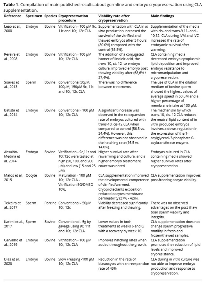 O ácido linoleico conjugado (CLA) é uma mistura de isômeros posicionais do ácido linoleico encontrado em carne e laticínios de ruminantes. É um tipo de gordura trans muito utilizada por atletas para como suplemento alimentar devido a um suposto efeito de maximizar a utilização das reservas de gordura corporal. O interesse na suplementação de dietas e meios de cultura com o CLA é uma área emergente, exigindo estudos para elucidar seus benefícios nos parâmetros reprodutivos e na criopreservação. Dessa forma, o objetivo dessa revisão foi discutir os efeitos do CLA na criotolerância de oócitos, espermatozóides e embriões. Alguns estudos já demonstraram seu uso na criopreservação da linhagem germinativa. Entre esses, foi observado que a suplementação de CLA durante a maturação in vitro de oócitos pode aumentar sua viabilidade pós-congelamento e capacidade de desenvolvimento. Em relação ao uso de CLA no esperma, existem poucos estudos e seus resultados ainda são inconclusivos. Por último, estudos sobre a suplementação de CLA em meios de cultura de embriões mostraram resultados promissores, indicando que essa molécula bioativa é capaz de modular a captação de lipídios em blastômeros. No total, essas descobertas demonstram o potencial uso do CLA como uma molécula bioativa para melhorar a linha germinativa e a criotolerância ao embrião e abrir novas perspectivas no campo da reprodução humana e animal.