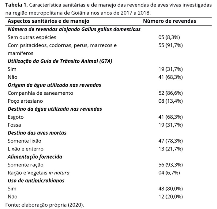 Para a coleta das amostras, foram selecionados, por conveniência, 60 estabelecimentos, distribuídos em 12 municípios da região metropolitana de Goiânia, que abrigavam Gallus gallus domesticus. O número de revendas estudadas variou com base no número existente em cada município. As revendas foram visitadas e questionários estruturados compostos por questões fechadas foram respondidos pelos responsáveis dos estabelecimentos com a finalidade de obter informações sobre origem das aves, fonte e destino da água utilizada, destino das aves mortas e dos dejetos, alimentação fornecida, comercialização e utilização de antimicrobianos.