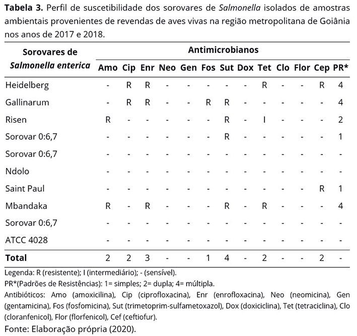 O perfil de suscetibilidade antimicrobiana foi determinado pelo método de Difusão em Disco de acordo com Clinical and Laboratory Standards Institute – CLSI(7). Os antibióticos testados foram amoxicilina (10 mcg), ciprofloxacina (5 mcg), doxiciclina (30 mcg), enrofloxacina (5 mcg), fosfomicina (200 mcg), florfenicol (30 mcg), gentamicina (10 mcg), neomicina (30 mcg), ceptiofur (30 mcg), tetraciclina (30 mcg), trimetopim-sulfametazole (1,25/23,75 mcg) e cloranfenicol (30 mg). Foi utilizada como cepa de referência Salmonella enterica ATCC 14028.