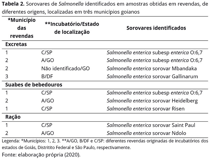 Analisando as categorias de amostras, verificou-se que 1,9% (4/209) das excretas, 1,4% (3/209) dos suabes de bebedouros e 0,95% (2/209) das ração foram positivas para o patógeno, as quais foram caracterizadas antigenicamente como sorovares Heidelberg, Gallinarum, Risen, Ndolo, Saint Paul e Mbandaka subesp enterica O:6,7. Destaca-se que as revendas com amostras positivas avaliadas neste estudo receberam aves de incubatórios certificados pelo MAPA. Sobre isso, sublinha-se que o serviço de defesa do estado de Goiás recebeu, no período de 2018 até junho de 2019, a notificação de 416 focos de Salmonella, sendo 396 de salmonelas paratíficas, sete de Salmonella Pullorum e dois de Salmonella Gallinarum, totalizando 27.111.306 aves dentro dos focos(1).