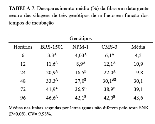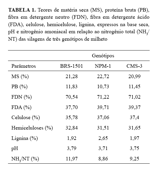 neutro (FDN) das silagens de milheto BRS-1501, NPM-1 e CMS-3 em ovinos.