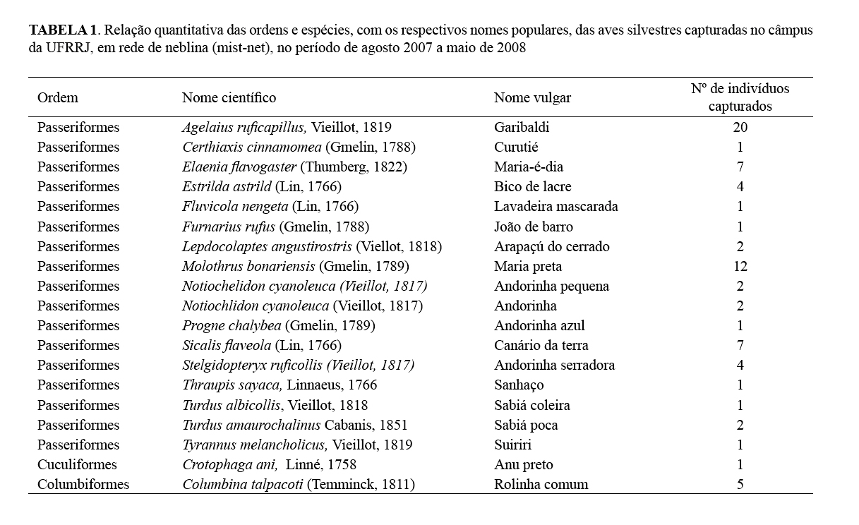 aves silvestres capturadas no câmpus da UFRRJ entre agosto de 2007 e