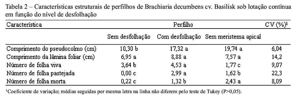 Em pastagem de B. decumbens sob lotação contínua, perfilhos sem desfolhação possuem menor comprimento do pseudocolmo e reduzido número de folha morta.