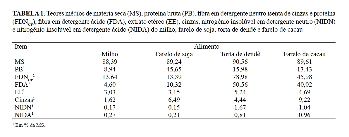 (FDN) e da fibra em detergente ácido (FDA) do milho (Zea mays), do farelo de soja (Glicyne max L.), da torta de dendê (Elaeis guineensis Jacq.) e do farelo de cacau (Theobroma cacao