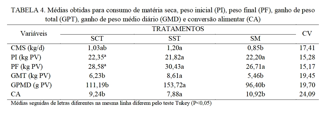 tratamentos: SCT – silagem de sorgo com tanino no grão; SST – silagem
