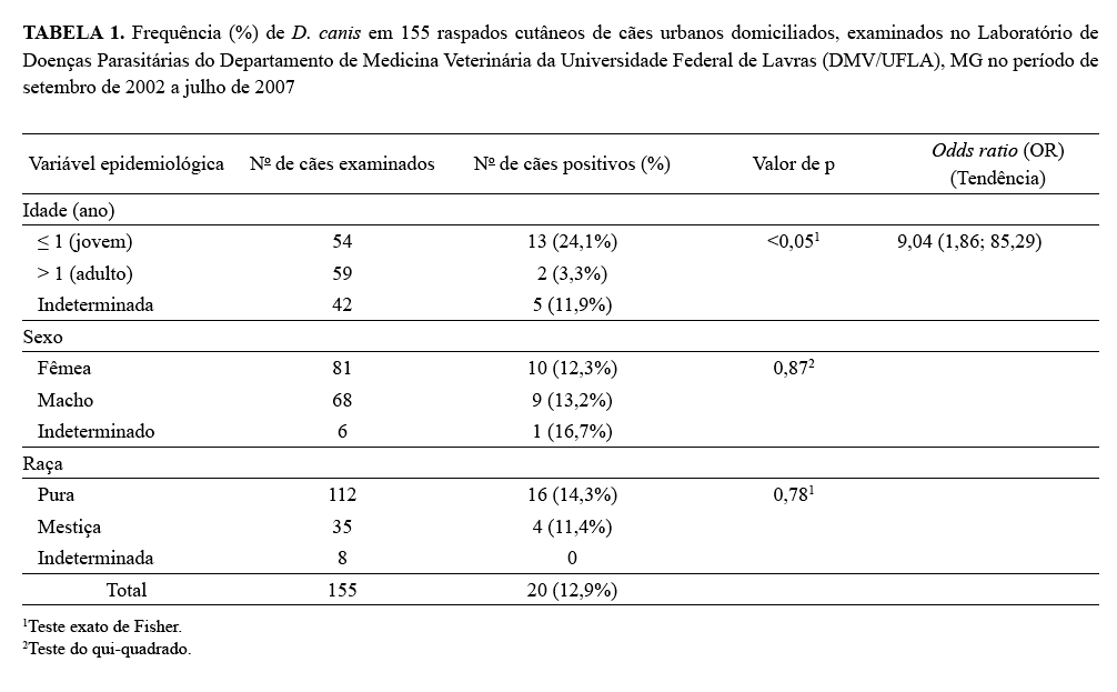 Demodex canis nos cães jovens (≤1 ano de idade) em relação aos animais adultos (>1 ano de idade), suspeitos de demodicose canina.