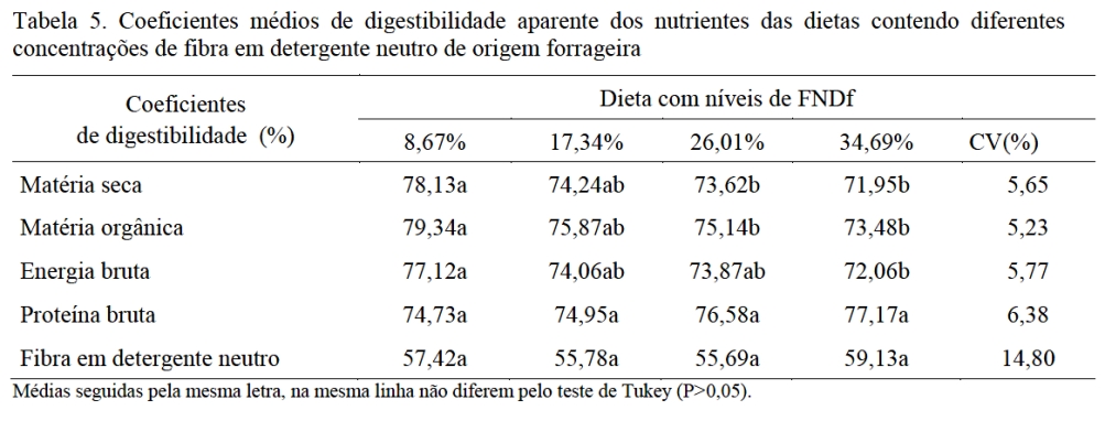 (FDA) bem como os coeficientes de digestibilidade aparente da MS, MO, EB e FDA