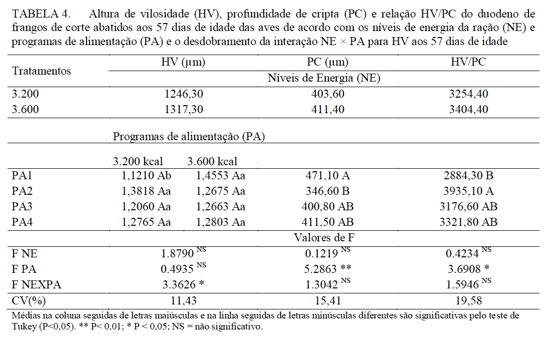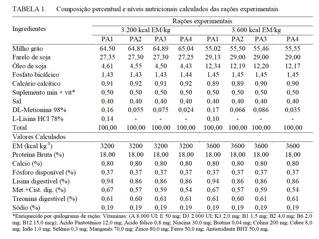 (3.200 e 3.600 kcal EM/kg) e quatro programas de alimentação (PA),