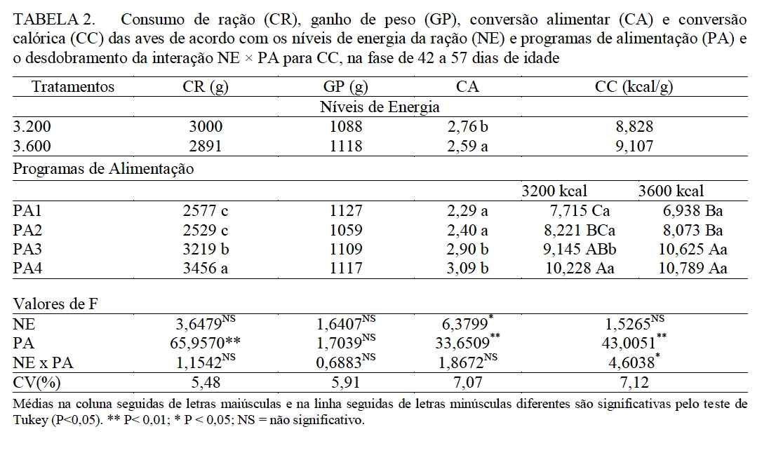 aves. Os fatores analisados foram dois níveis de energia (NE)