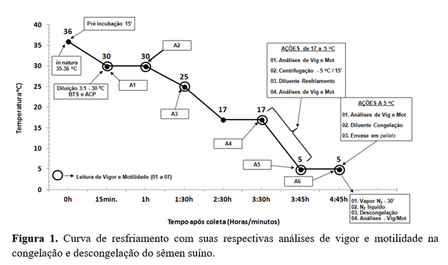 Foram utilizadas as características vigor espermático (0 a 5)(10) e motilidade espermática (0 a 100%), sendo para essa finalidade avaliados três diferentes campos no microscópio e repetindo-se as análises em seis diferentes momentos durante a curva de resfriamento: Análise 1 (A1) = feita logo após a diluição (diluição 3:1) do ejaculado, a 30 °C; Análise 2 (A2) = feita após os 45 minutos da diluição, também a 30 °C; Análise 3 (A3) = feita após os 30 minutos do sêmen a 25 °C; Análise 4 (A4) = feita após as 2 horas na fase escura do sêmen a 17 °C; Análise 5 (A5) = feita após centrifugação e diluente de resfriamento (diluição 2) ser adicionado a 5 °C; Análise 6 (A6) = feita após 1 hora do sêmen a 5 °C, antes do diluente de congelação (diluição 3) ser adicionado (Figura 1).