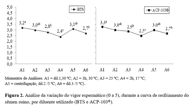 Avaliando os resultados do comportamento de cada diluente no decorrer das análises que compõe a curva de resfriamento (Figura 1), evidenciou-se uma queda contínua dos valores até A4, em ambos os tratamentos. Este tipo de tendência já era esperado devido à diminuição da temperatura. Dentro de cada tratamento, houve diferenças dos resultados do vigor espermático durante a descida da temperatura, tendo apresentado o valor mais baixo na análise A4, independentemente do diluente utilizado.