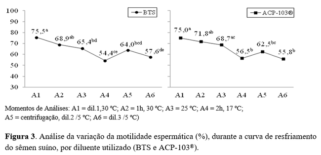 Quanto ao efeito da curva, para a característica motilidade, os dois diluentes (Figura 3) apresentaram comportamento distintos entre si. No ACP, a variação dos resultados das análises na curva foi menor, enquanto que no BTS houve uma diferença significativa em quase todos os momentos de análises quando comparados entre si. Conforme pode ser observado, também para esta característica, nos resultados dos quatros primeiros pontos analisados (A1 a A4) houve uma redução na motilidade espermática em ambos os tratamentos, pois esta queda natural pode ser explicada pelo abaixamento da temperatura, bem como pelas alterações de pH e osmolaridade do meio, já que com o decorrer do tempo há o consumo do substrato energético e a produção de metabólitos(20).