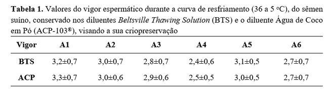 Quanto à curva de resfriamento, esta se adequou ao processo de congelação lenta, mantendo a viabilidade espermática até a congelação do sêmen. No entanto, a taxa ótima de resfriamento, congelação e descongelação pode diferir de acordo com a composição do diluente utilizado(51). Desta forma, são necessários maiores estudos utilizando o diluente ACP-103 na criopreservação do sêmen suíno para a obtenção de melhores resultados.