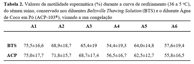 Como pode ser visto na Tabela 2, a motilidade espermática foi também analisada em seis diferentes momentos durante o abaixamento de temperatura do sêmen e, da mesma, forma ela não apresentou diferenças estatisticamente significativas (P>0,05) entre os resultados das seis análises (A1 a A6) em ambos os diluentes.