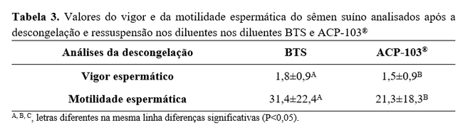 Com relação ao efeito do diluente após a descongelação e ressuspensão do sêmen (Tabela 3), o BTS apresentou melhores resultados (P<0,05) para as características vigor (1,8±0,9) e motilidade espermática (31,4±22,4), quando comparado com os obtidos com o diluente ACP (1,5±0,9 e 21,3±18,3, respectivamente), confirmando a boa condição que este meio químico oferece aos espermatozoides.