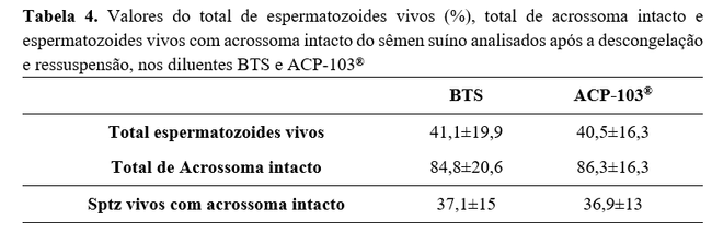 Quanto às características total de espermatozoides vivos, total de acrossoma intacto e total de células vivas com acrossoma intacto, o BTS e o ACP apresentaram resultados semelhantes, não havendo diferença significativa (P>0,05) entre os diluentes (Tabela 4). Considerando-se que a congelação de sêmen nos quais variam o crioprotetor, a velocidade no abaixamento de temperatura, os tipos de embalagens para conservação e os métodos de descongelação(29), estudos adicionais ainda são necessários para se consolidar uma técnica com resultados satisfatórios após descongelação.
