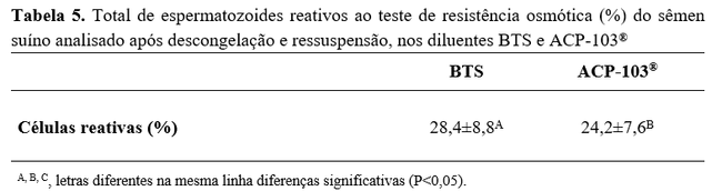 Conforme pode ser visto na Tabela 5, quanto à avaliação da funcionalidade da membrana do espermatozoide, os diluentes testados apresentaram diferença significativa (P>0,05) em que o BTS (28,4%) apresentou maior percentual de células com membranas funcionais do que o ACP (24,2%). Desta forma, a proteção conferida pelo diluente utilizado é importante, uma vez que o espermatozoide do varrão é muito sensível ao estresse osmótico, devido às mudanças de volume durante a congelação, assim sendo, a curva de resfriamento é essencial para preservar a integridade dessas células(16).