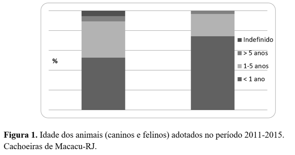 Dos animais adotados, a grande maioria, tanto no caso dos caninos quanto no de felinos, era de filhotes e jovens com menos de um ano de idade e o menor percentual envolveu os animais idosos, acima de cinco anos (Figura 1). Esses dados diferem daqueles encontrados em pesquisa conduzida por Weiss et al.(23) nos EUA, cujos adotantes demonstraram preferência por adoção de animais idosos nos abrigos.