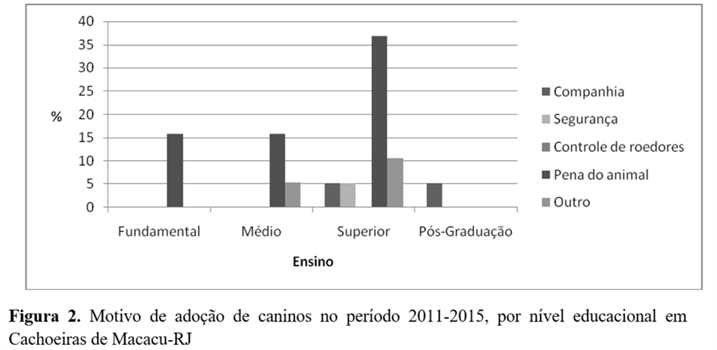 Frank(33) encontrou associação da adoção de animais com menor renda e com menor escolaridade quando comparado com a compra de animais. Estudo de Domingues et al.(29) mostrou que a guarda responsável melhora com o aumento da escolaridade e, segundo Reichmann et al.(3) a densidade populacional de animais domésticos é mais baixa nas classes sociais mais abastadas, que são exatamente aquelas com melhores condições econômicas para manter esses animais.