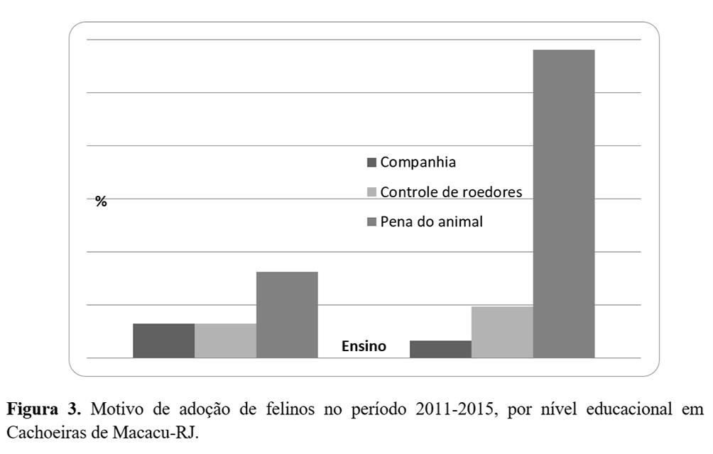 No caso dos caninos, o principal motivo da adoção foi a pena do animal, em todos os níveis educacionais, exceto para os pós-graduados, onde foi a companhia. Já no caso dos felinos também predominou a pena do animal em todos os níveis educacionais. (Figuras 2 e 3). Diversas pesquisas vêm demonstrando predomínio da companhia e da segurança como motivações para se ter um animal de estimação(34,20,28,30). Já diversos estudos vêm mostrando que o principal motivo para adoção de animais foi o fato dos adotantes gostarem de animais(8,19,24). De modo geral, a afeição pelos animais, seja pelo fato de gostar deles e ter pena, seja pelo fato de querê-los como companhia são fatores que preponderam na opção por ter um animal de estimação.