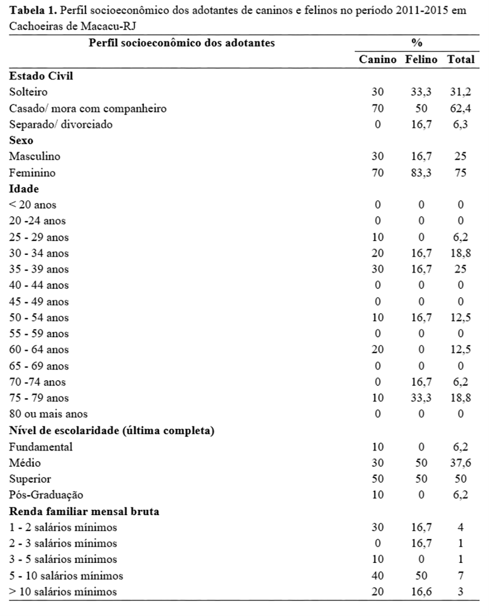 Houve predomínio de casados como adotantes (62,4%). No caso dos caninos estes representaram 70%, enquanto que felinos foram 50%. O maior percentual de adotantes foi de indivíduos do sexo feminino (75%), com 70% no caso de caninos e 83,3% no caso dos felinos (Tabela 1). Esses resultados estão de acordo com os encontrados com Paploski et al.(26) no qual 55% dos adotantes entrevistados eram do sexo feminino e 79,3% residia com o companheiro. Ambas as pesquisas refutam o paradigma de predomínio de adotantes solitários em busca de companhia.