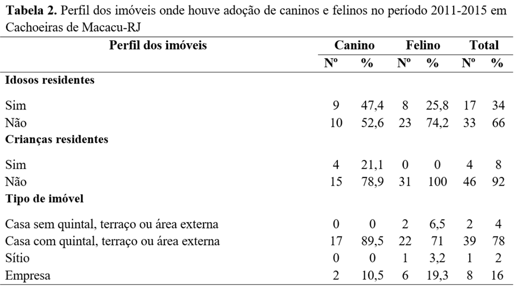 Na maior parte dos imóveis onde houve adoção de animais não havia idosos residindo (66%) e nem crianças (92%). Em nenhum imóvel onde houve adoção de felinos havia criança residindo. Esses dados mostram que os animais, de modo geral, não foram adotados no intuito de socializar e fazer companhia especificamente a crianças e idosos. Azevedo et al.(24) também constataram que somente 1,5% dos animais de companhia foram adquiridos para socializarem com crianças.