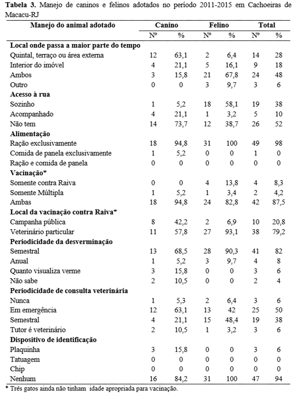 Apesar da maior parte (52%/ n=26) ter relatado que os animais adotados não tinham acesso à rua sozinhos, um percentual relevante de 38% (n=19) tinha esse acesso. No caso dos caninos, 73,7% (n=14) não tinham acesso sozinhos à rua, mas no caso dos felinos 58,1%(n=18) o tinham (Tabela 3). Alves et al.(21) demonstram que a situação de restrição territorial dos animais é proporcional ao tamanho das cidades, sendo menor nas cidades de menor porte, como é o caso do município onde a pesquisa foi desenvolvida. Pesquisa desenvolvida por Silvano et al.(22) detectou que a maioria dos animais tinham livre acesso à rua desacompanhados. Canatto et al.(19) demonstraram que 64,4% dos cães tinham livre acesso à rua, contra 42,5% dos gatos. Outro estudo demonstrou que 19,5% dos animais tinham livre acesso à rua e 26,9% dos gatos eram criados totalmente soltos, com total acesso à rua. De Carli & Morais(28) encontraram 9,2% dos cães e 50% dos gatos com livre acesso à rua. Catapan et al.(20) encontraram 6,3% dos cães e 36% dos gatos com livre acesso à rua. Percebe- se que a restrição territorial de felinos é mais negligenciada do que a de caninos, o que é um grande risco para a transmissão de zoonoses, especialmente a esporotricose, que vem se apresentando como uma importante epidemia zoonótica associada aos gatos no estado do Rio de Janeiro(35,36).