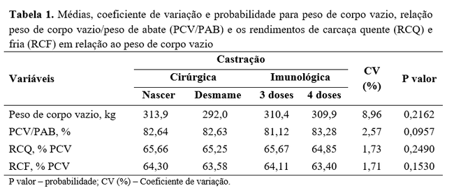 O peso de corpo vazio (PCV) não foi influenciado pelos tratamentos avaliados (Tabela 1). Embora as castrações tenham ocorrido em diferentes idades do animal, e dessa forma com possibilidade de um pequeno aporte do hormônio testosterona, principalmente do grupo imunocastrado com ação definitiva aos nove meses, este fato não foi suficiente para promover diferenças substanciais no peso de abate e consequentemente no PCV.